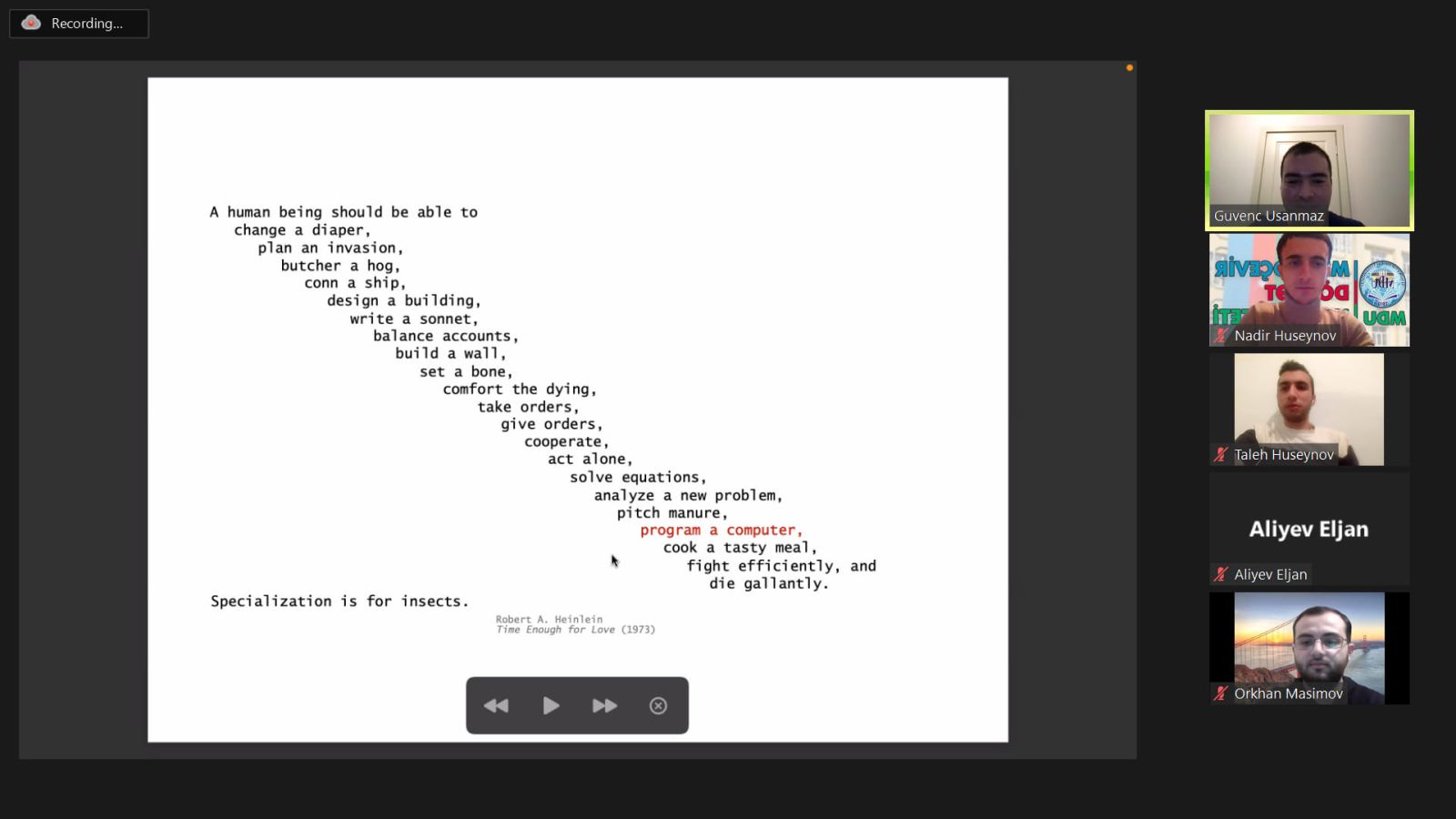 Təlim müddətində beynəlxalq təlimçi Güvenc Usanmaz "Genel hatlarıyla bilgisayar bilimleri ve proqramlama" mövzusunda iştirakçılara təlim keçib. Təlimin sonunda iştirakçıların sualları cavablandırılıb.