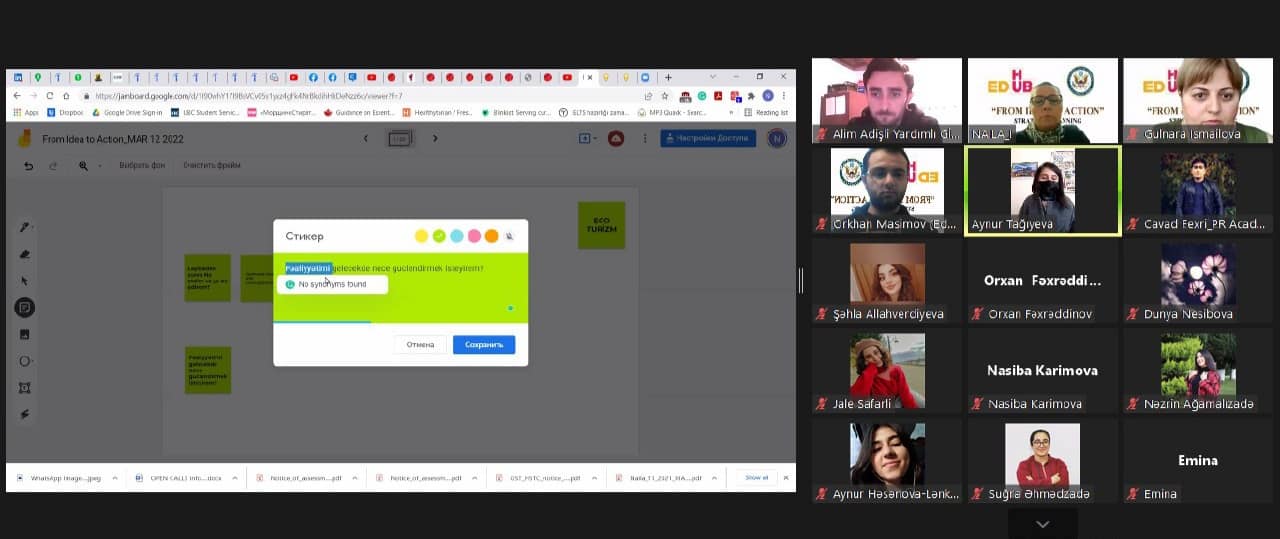 Görüş daha sonra komanda üzvlərinin layihələrinin davamlılığı barədə müzakirəsi ilə davam edib. İştirakçılar onlayn alətlərin vasitəsi ilə qrup işləri, müzakirələr edib, layihələrinin davamlılığı üçün təklif planı hazırlayıblar.