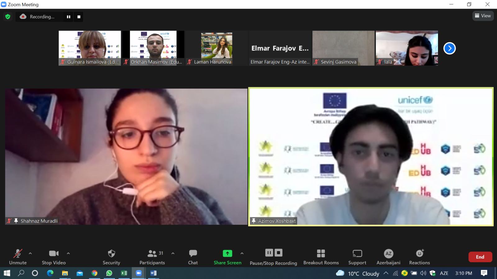 “Yarat, inkişaf et, töhfə ver (Gənclərin İnkişaf yolu)” Avropa İttifaqının maliyyə dəstəyi, Gənclər və İdman Nazirliyi, UNİCEF Azərbaycan və Azərbaycan Respublikası Gənclər Fondunun tərəfdaşlığı ilə Konstitusiya Araşdırmalar Fondu və Education HUB tərəfindən icra olunub.